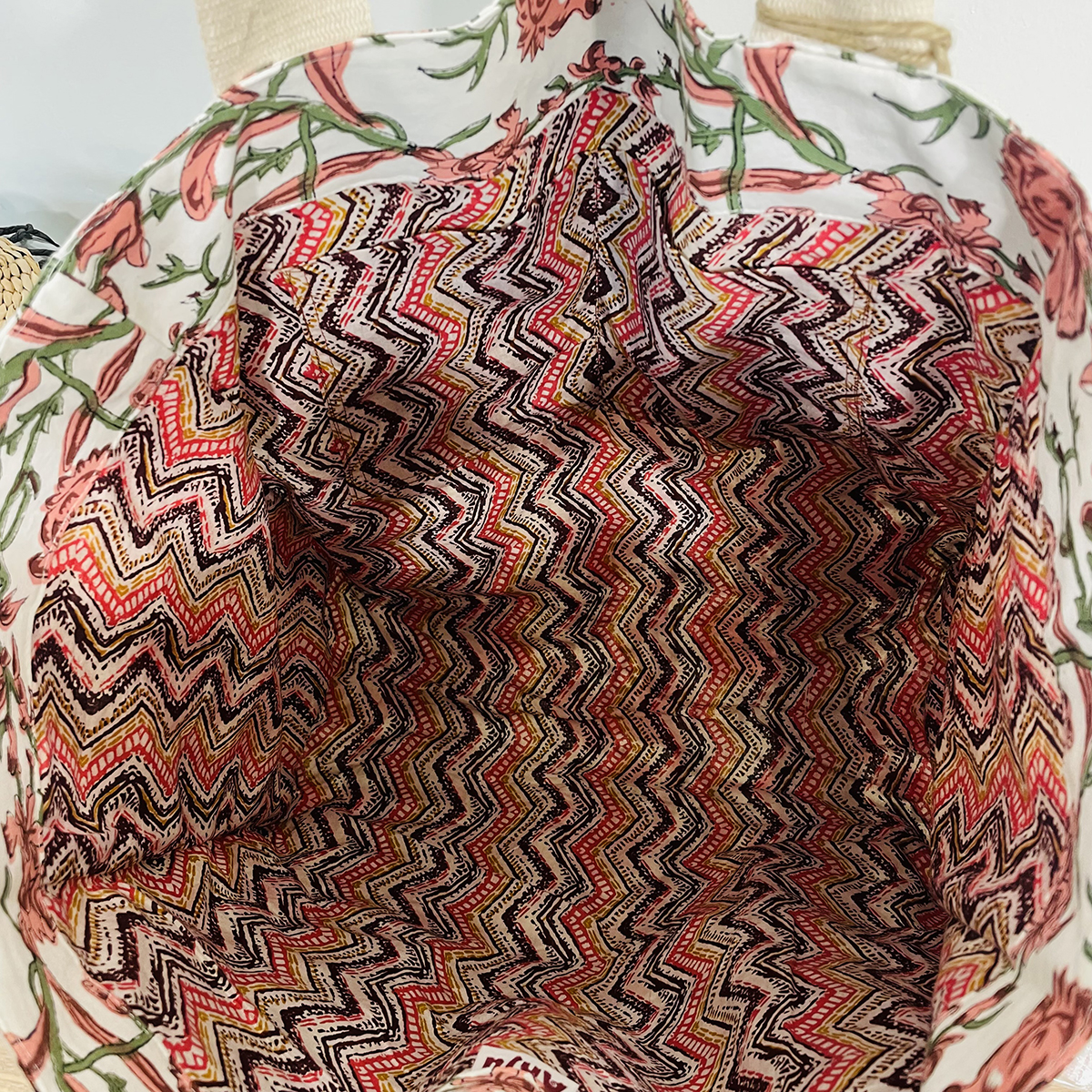 Crafted from durable canvas material, this bag offers sturdiness and reliability for everyday use. Its block-printed design adds an artistic flair, making it a unique and eye-catching accessory. Hand-printed and 100% Cotton.