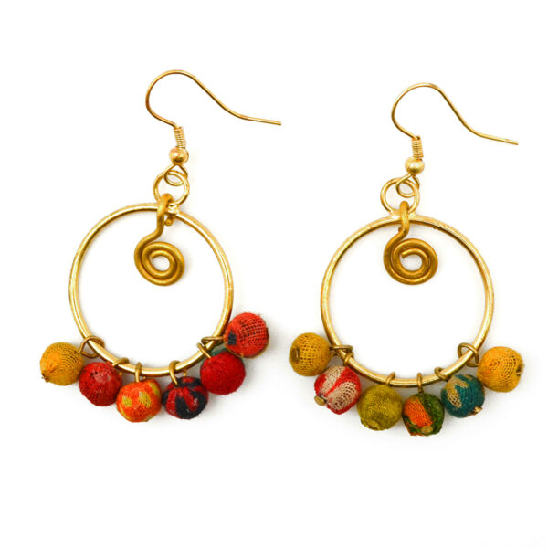 Handcrafted Aasha Earrings – Colorful earrings made with wooden beads wrapped with recycled sari fabrics. 1″ x 1.5″