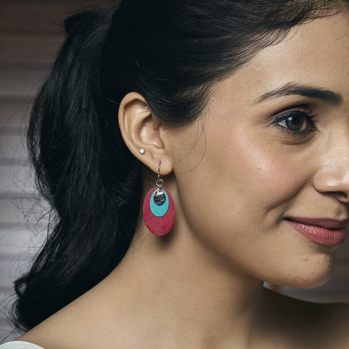 These Azure Flame Oval Layers Earrings are a colorful layered oval from our Azure Flame Collection. Handcrafted in India, they feature a bright red and teal patina over a silver-plated brass base.