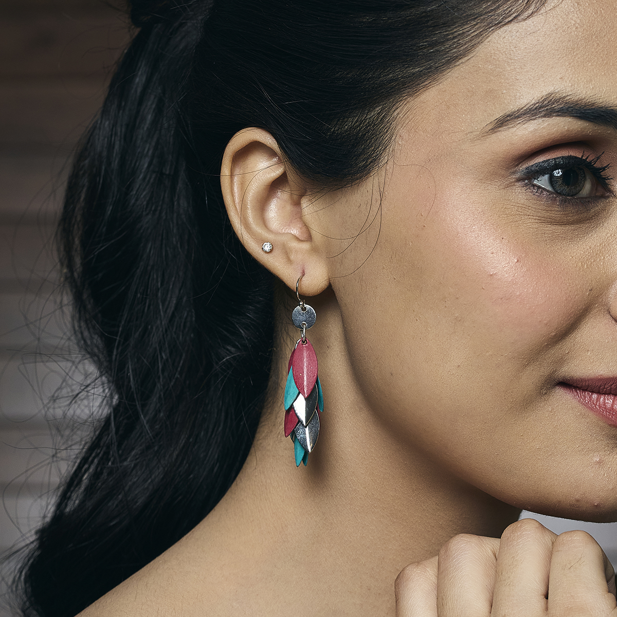 These Azure Flame Leaves Earrings are a cascading leaf chandelier from our Colourful Patina Collection. Handcrafted in India, they feature a bright red and teal patina over a silver-plated brass base.