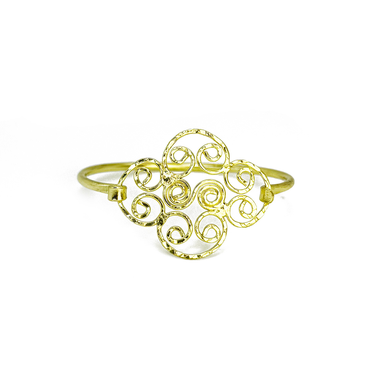 Wire bangle bracelet featuring a centered filigree scrollwork motif. Constructed from formed gold-plated brass wire.