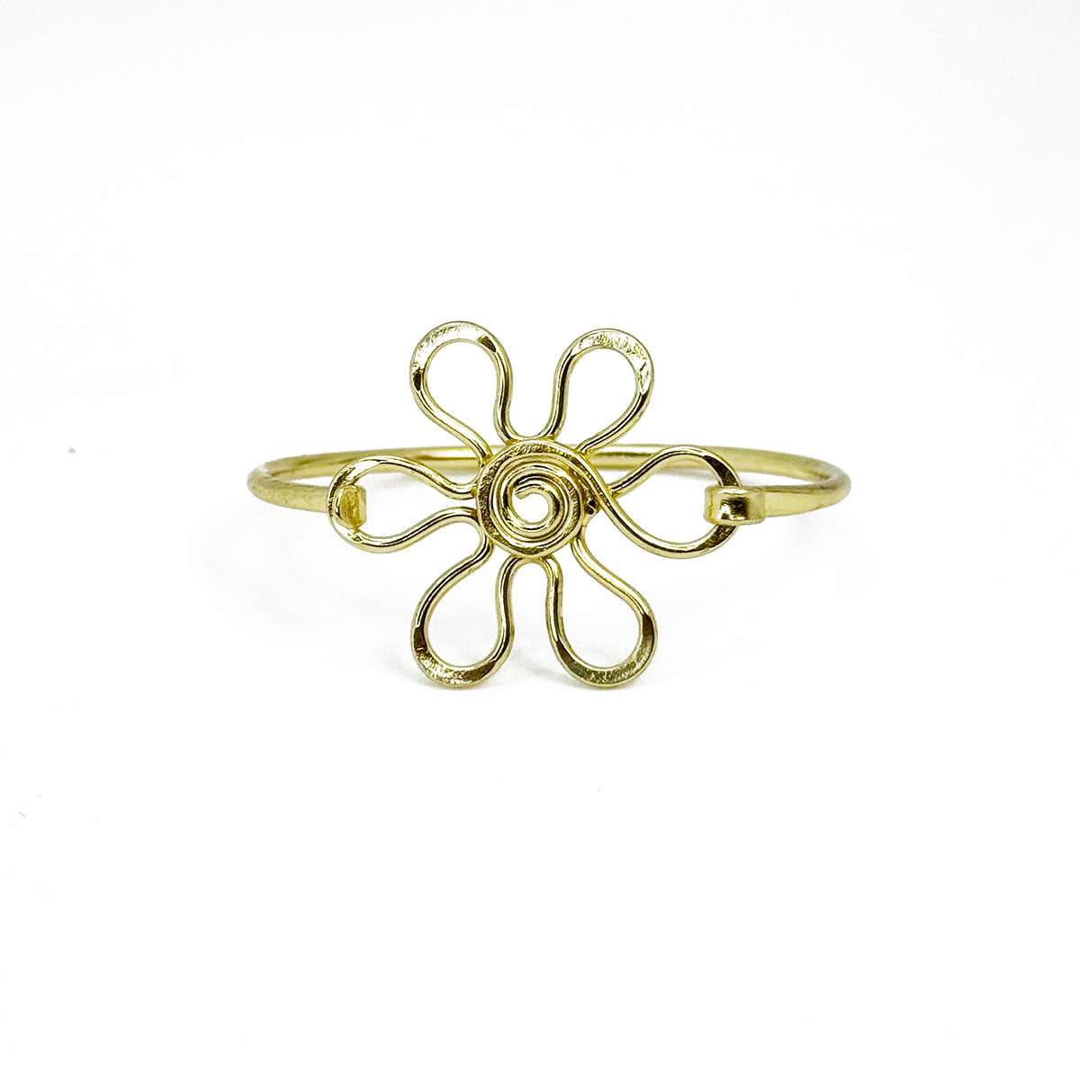Wire bangle bracelet featuring a six-petal flower outline with a central spiral detail. Hand-shaped from gold-plated brass wire.