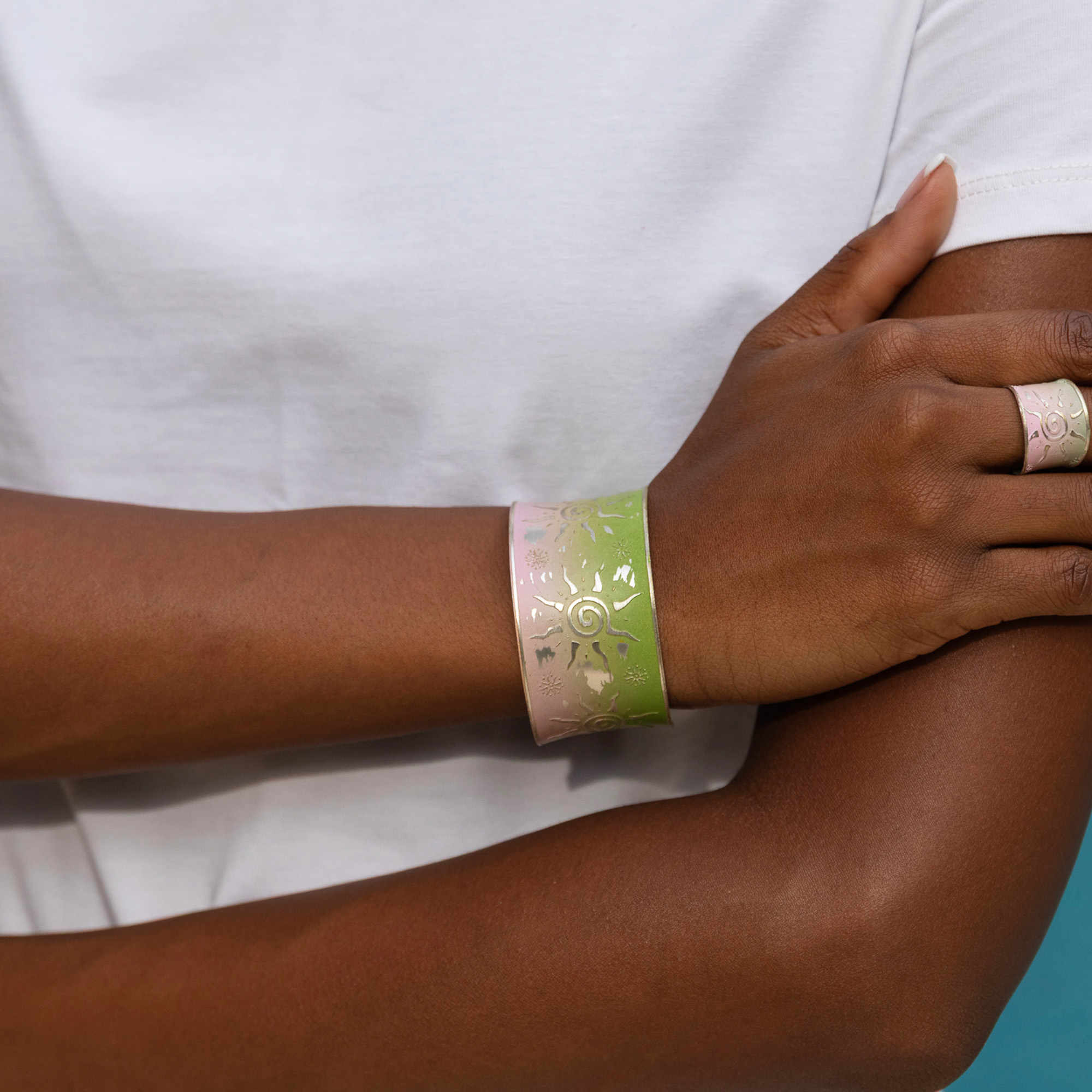 This Handcrafted Green & Pink Sun Patina Bracelet is a wide cuff design from our Patina Bracelet Collection. Handcrafted in India, this adjustable cuff bracelet features a whimsical sun motif on a green-to-pink ombre patina.