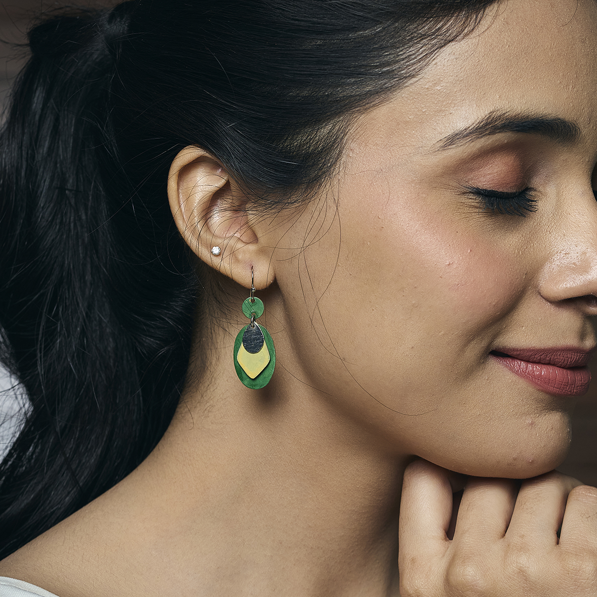 These Citrus Burst Oval and Kite Layers Earrings are a layered geometric design from our Colourful Patina Collection. Handcrafted in India, they feature a green and yellow patina over a silver-plated brass base.