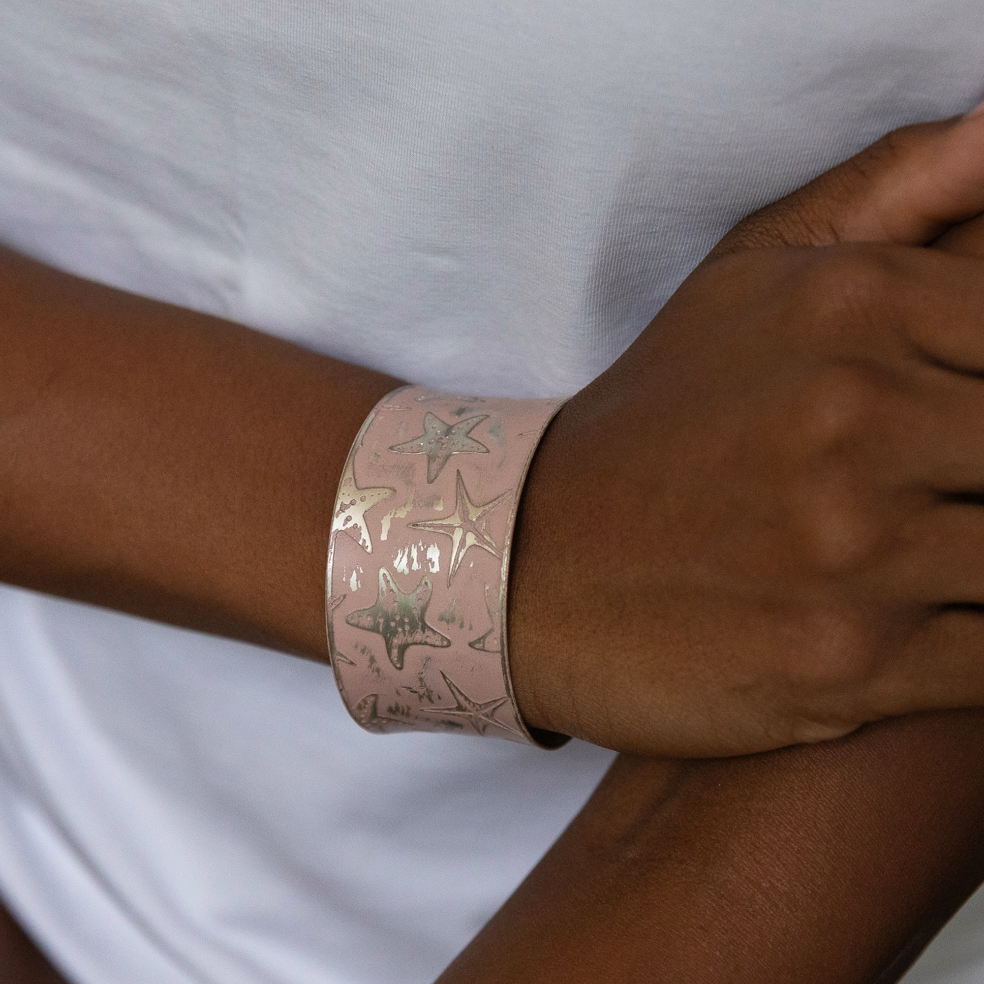 This Handcrafted Light Pink Starfish Patina Bracelet is a wide cuff design from our Patina Bracelet Collection. Handcrafted in India, this adjustable cuff bracelet features a scattered starfish pattern on a distressed light pink patina.