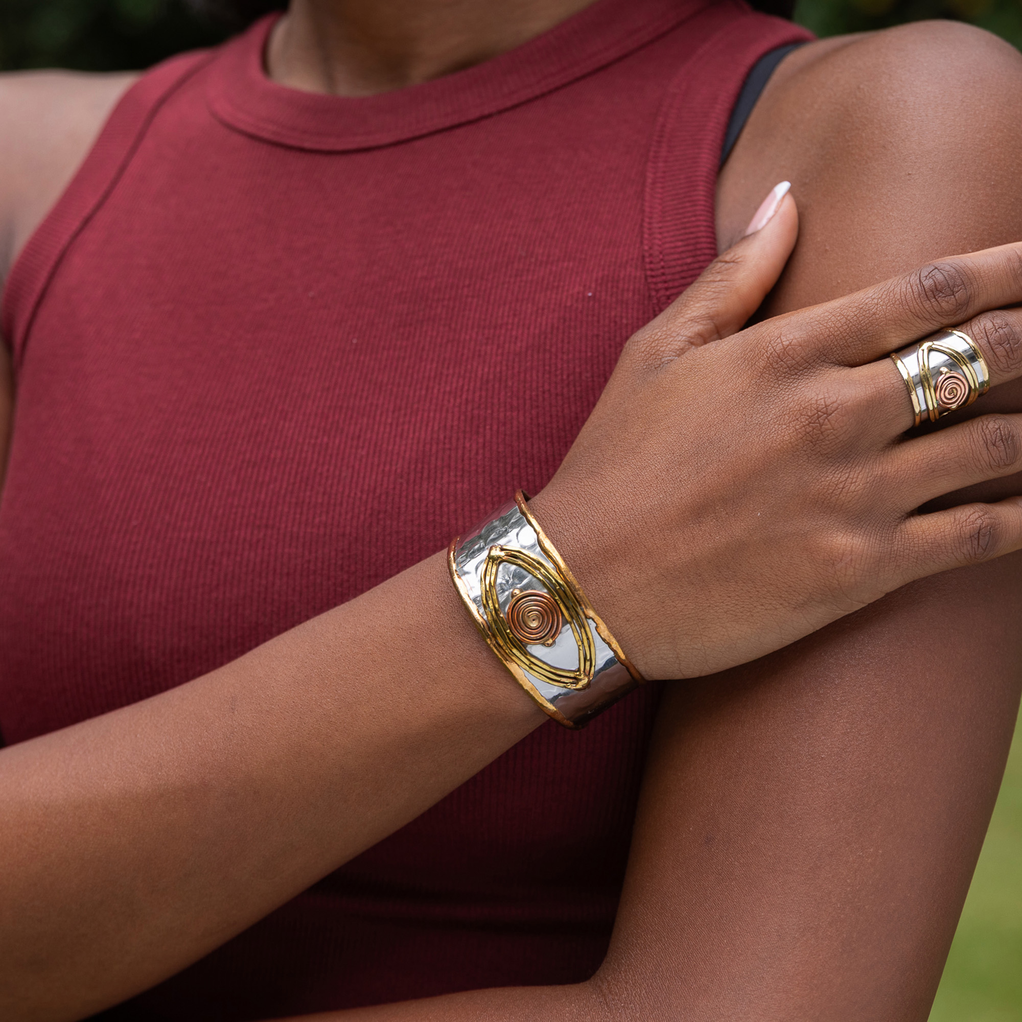 Artistic mixed metal cuff featuring an abstract eye design with a copper spiral pupil and brass outlines on hammered metal.