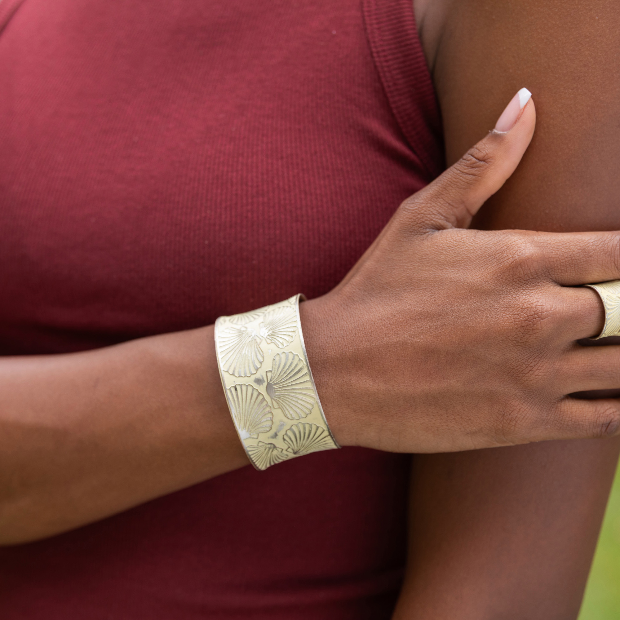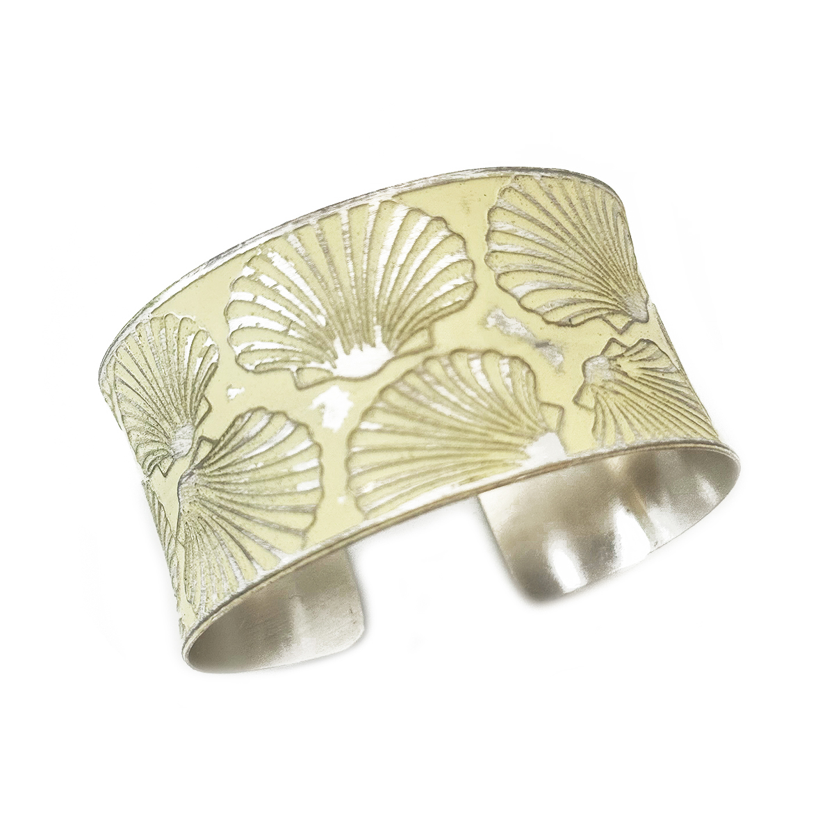 This Handcrafted Pale Yellow Scallop Shell Patina Bracelet is a wide cuff design from our Patina Bracelet Collection. Handcrafted in India, this adjustable cuff bracelet features an etched scallop shell pattern on a pale yellow patina.
