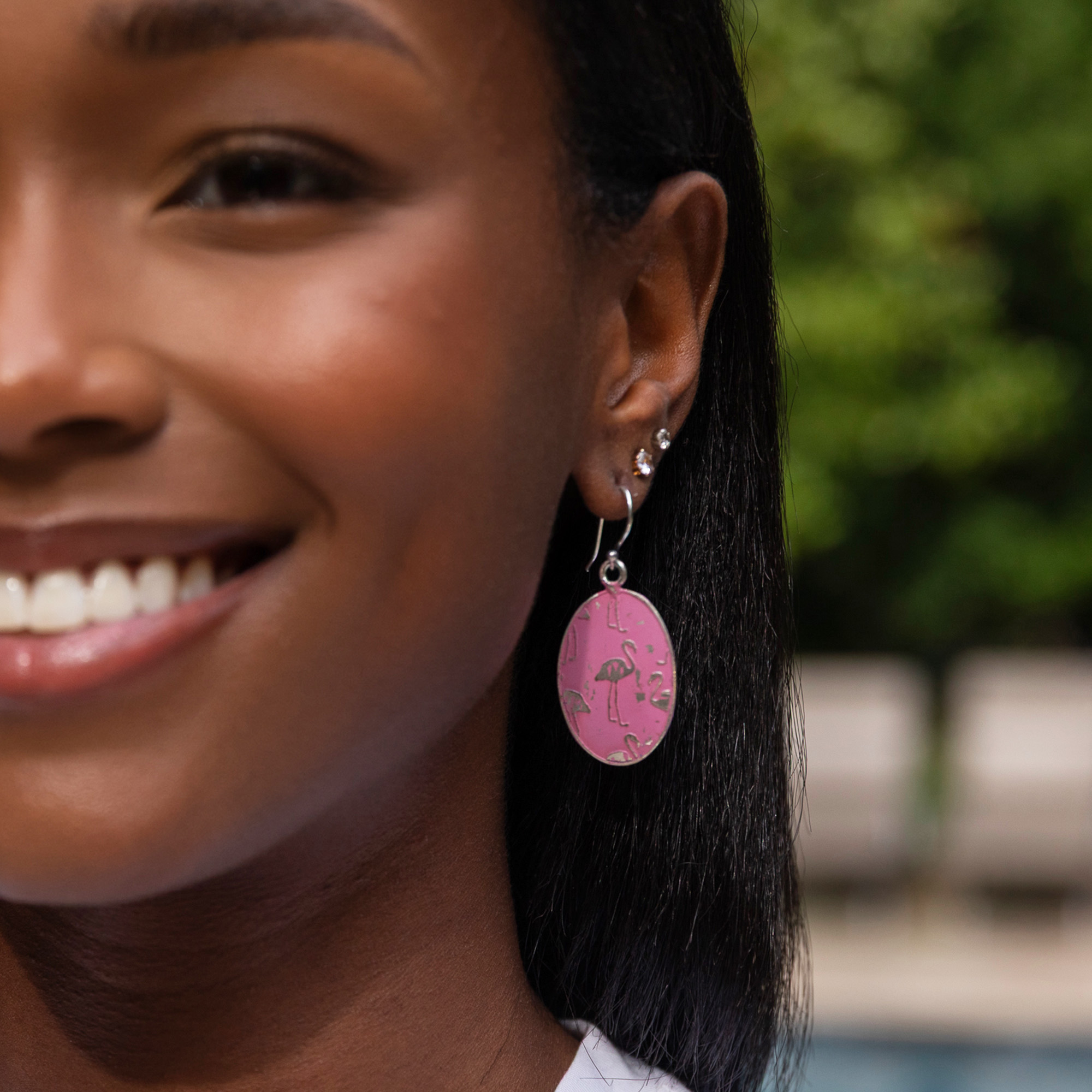 These Handcrafted Pink Flamingo Patina Earrings are an oval dangle design from our Patina Earring Collection. Handcrafted in India, these lightweight earrings feature a repeating flamingo pattern on a distressed pink patina.
