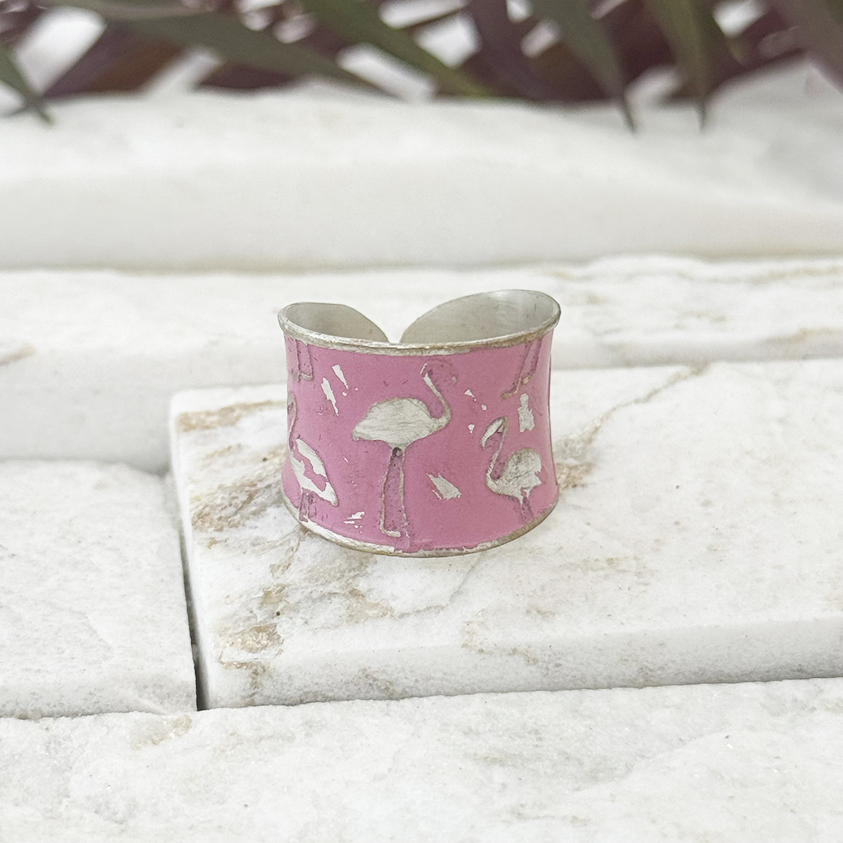 This Handcrafted Pink Flamingo Patina Ring is an adjustable design from our Patina Ring Collection. Handcrafted in India, this lightweight ring features a repeating flamingo pattern on a distressed pink patina.