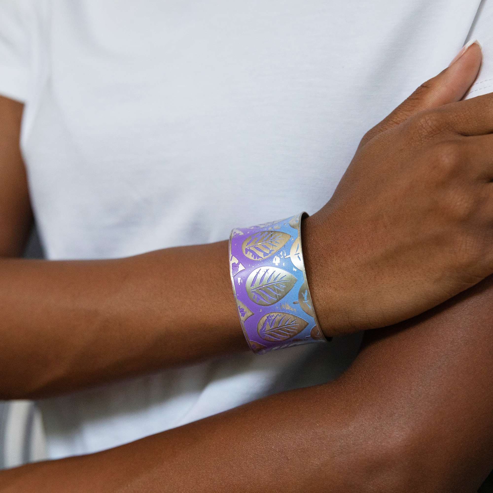 This Handcrafted Purple & Blue Leaf Patina Bracelet is a wide cuff design from our Patina Bracelet Collection. Handcrafted in India, this adjustable cuff bracelet features a bold leaf pattern on a purple-to-blue ombre patina.