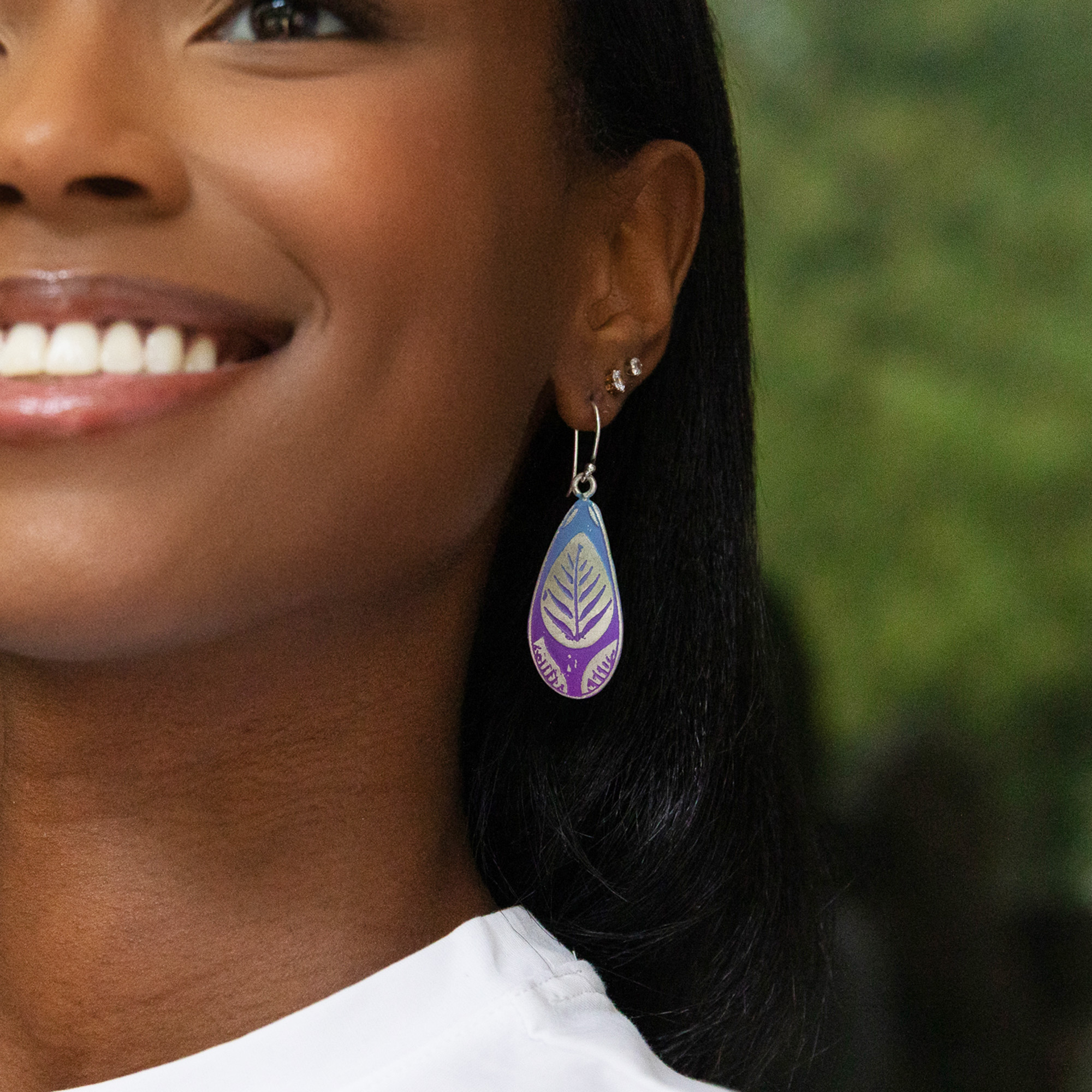 These Handcrafted Purple & Blue Leaf Patina Earrings are a teardrop dangle design from our Patina Earring Collection. Handcrafted in India, these lightweight earrings feature a bold leaf pattern on a purple-to-blue ombre patina.