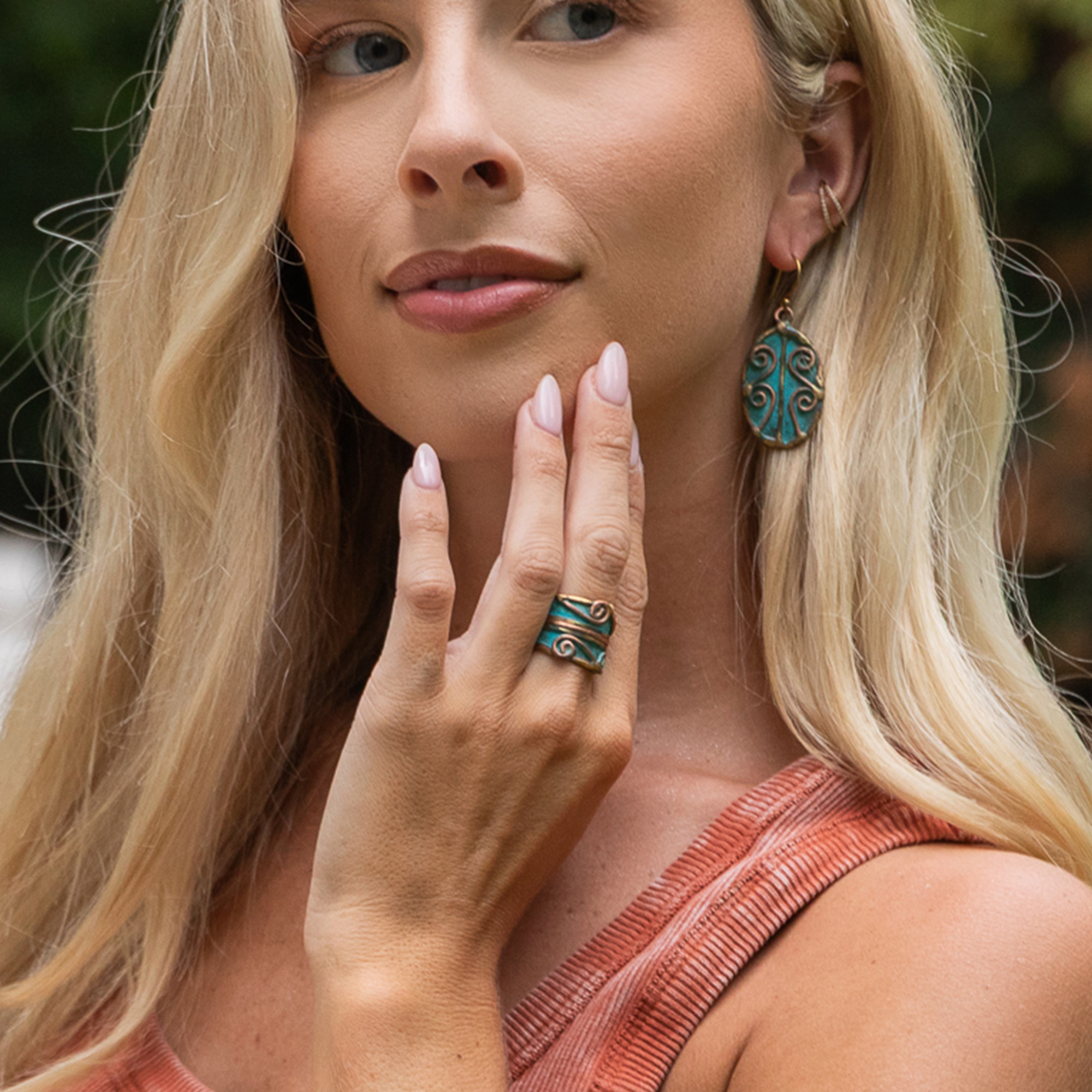 This Handcrafted Turquoise & Copper Scrollwork Brass Patina Ring is an adjustable wide-band design from our Patina Ring Collection. Handcrafted in India, this lightweight ring features elegant, symmetrical copper scrollwork and bands on a vibrant turquoise patina.