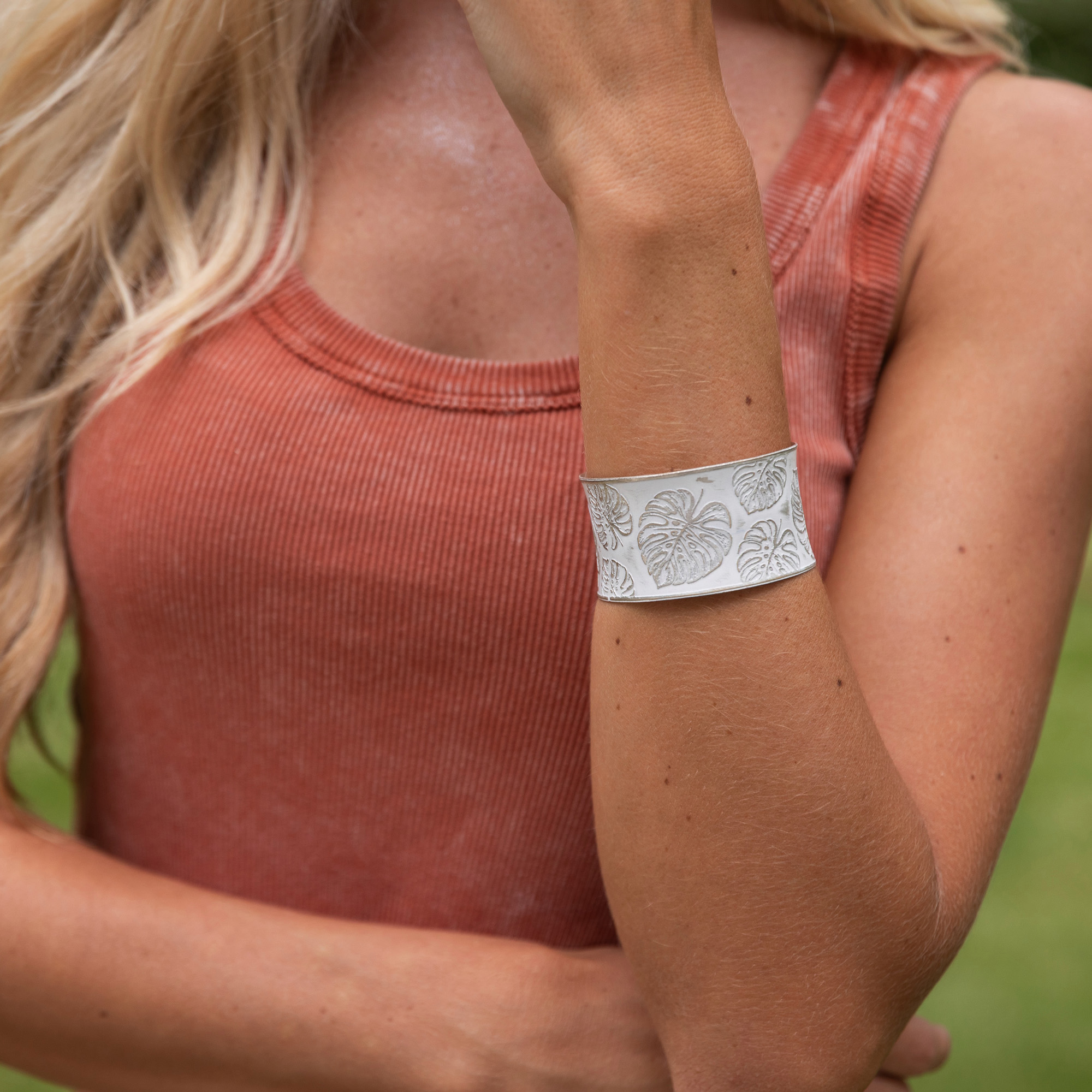 This Handcrafted White Monstera Leaf Patina Bracelet is a wide cuff design from our Patina Bracelet Collection. Handcrafted in India, this adjustable cuff bracelet features a striking monstera leaf pattern on a distressed white patina.