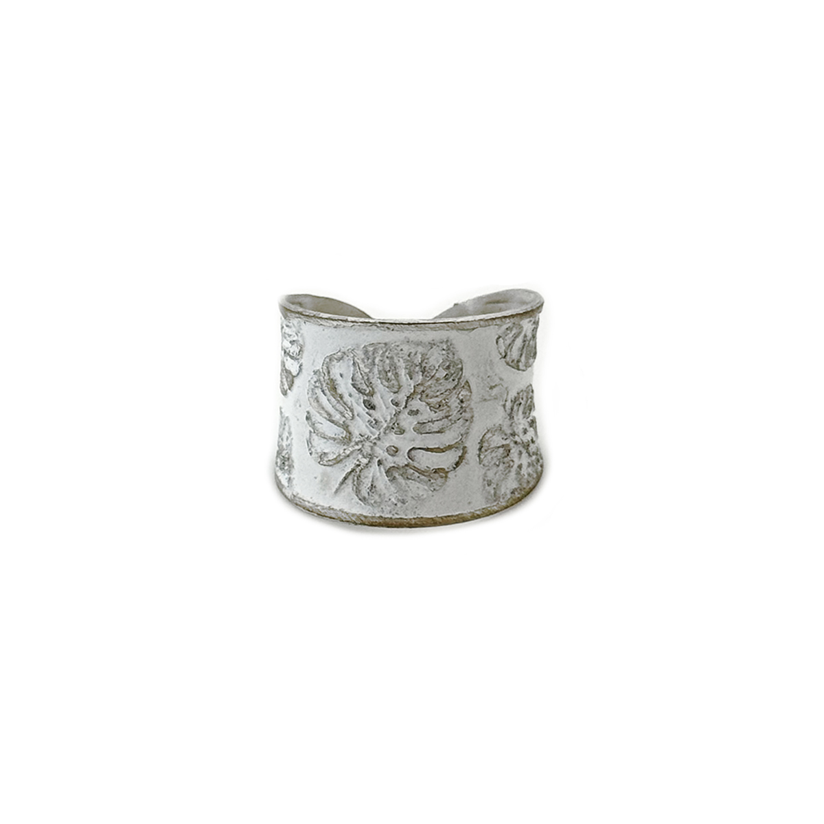 This Handcrafted White Monstera Leaf Patina Ring is an adjustable design from our Patina Ring Collection. Handcrafted in India, this lightweight ring features a monstera leaf pattern on a distressed white patina.