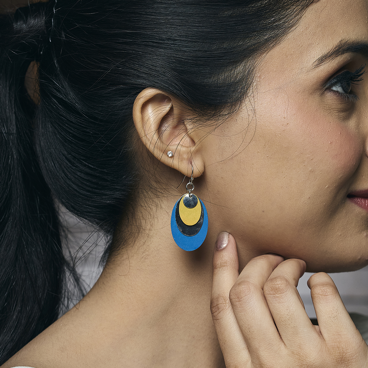 These Golden Hour Oval Layers Earrings are a colorful layered oval from our Colourful Patina Collection. Handcrafted in India, they feature a mustard yellow and blue patina over a silver-plated brass base.